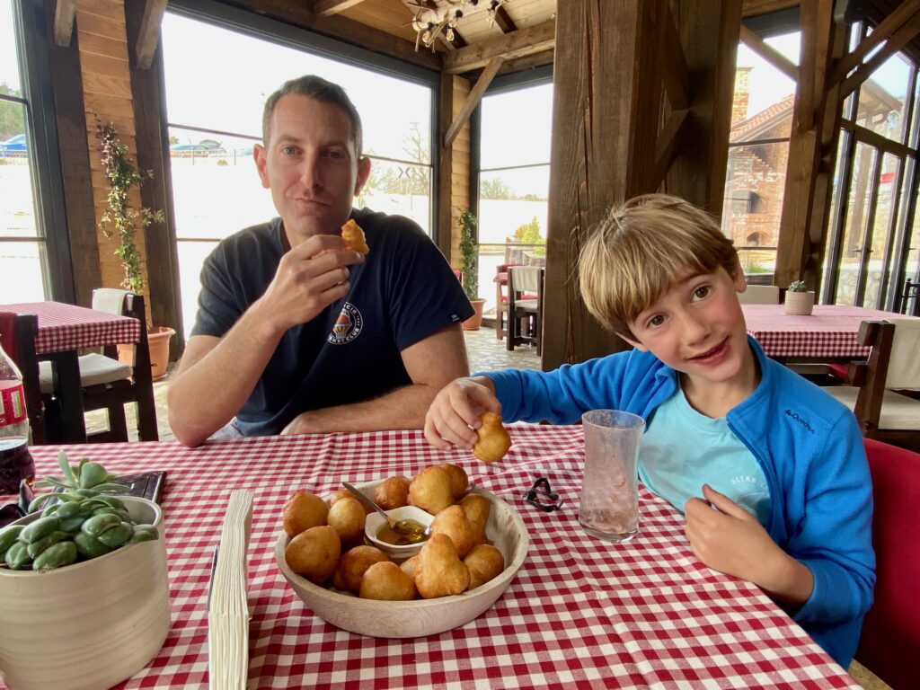 We spent a day exploring the Montenegrin interior, with captivating views on a 21-switchback road up into the mountains and sparsely populated, moon-like cratered and rocky landscapes as we drove further inland. On this route you pass through the village of Njeguši, which is known for its smoked ham. This is where we sampled this dried, smoked prosciutto known as Njeguski prsut, some local sheep cheese, and honey-soaked jarred figs from farm stands (a lot of pointing, gesturing, and smiling, as the proprietor didn’t speak English and I only had a few Montengrin words under my belt!), as well as “priganice” (fried dough balls served with honey or cheese) at a small family hotel with playground along the road (Etno Selo Sveti Georgije). This day trip can be done in a just a few hours even going at a relaxed pace, and felt like a slice of the more off-the-beaten-path Montenegro.