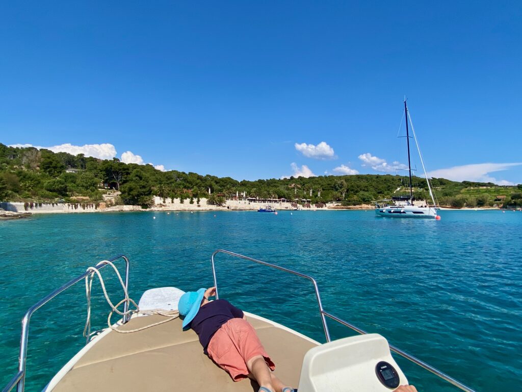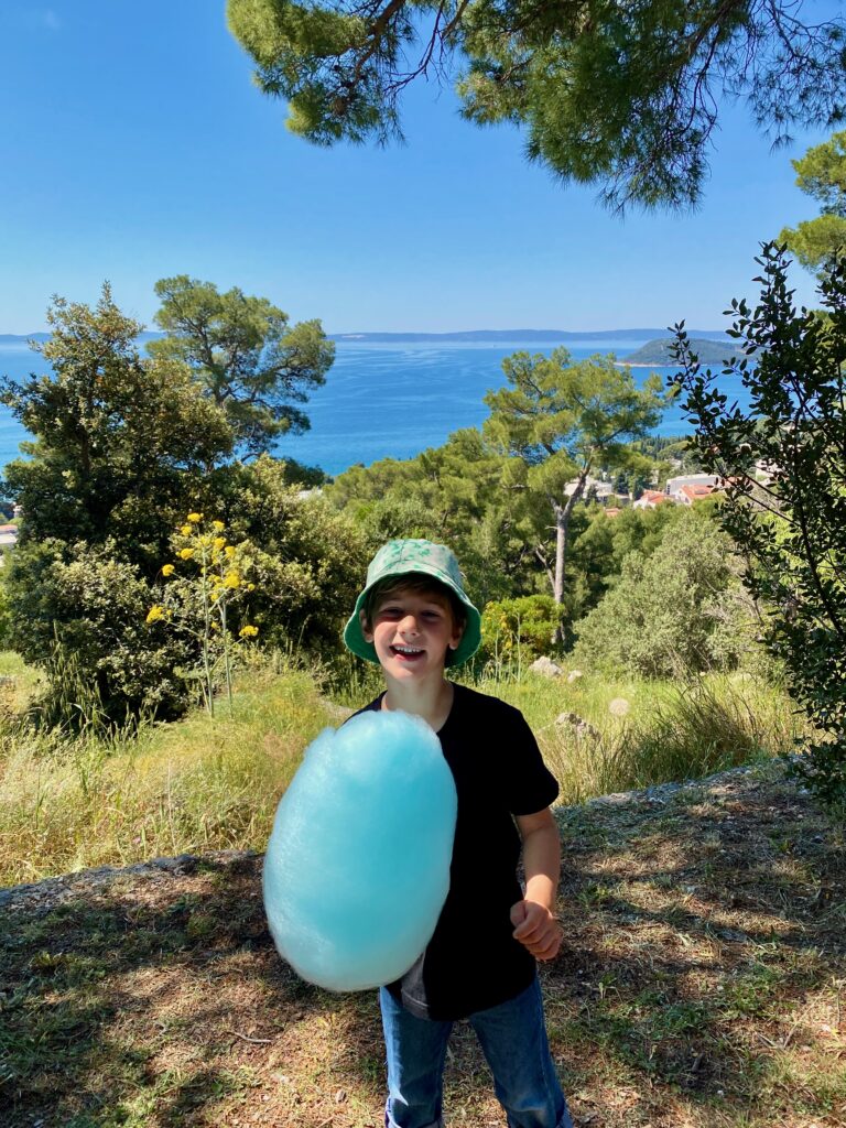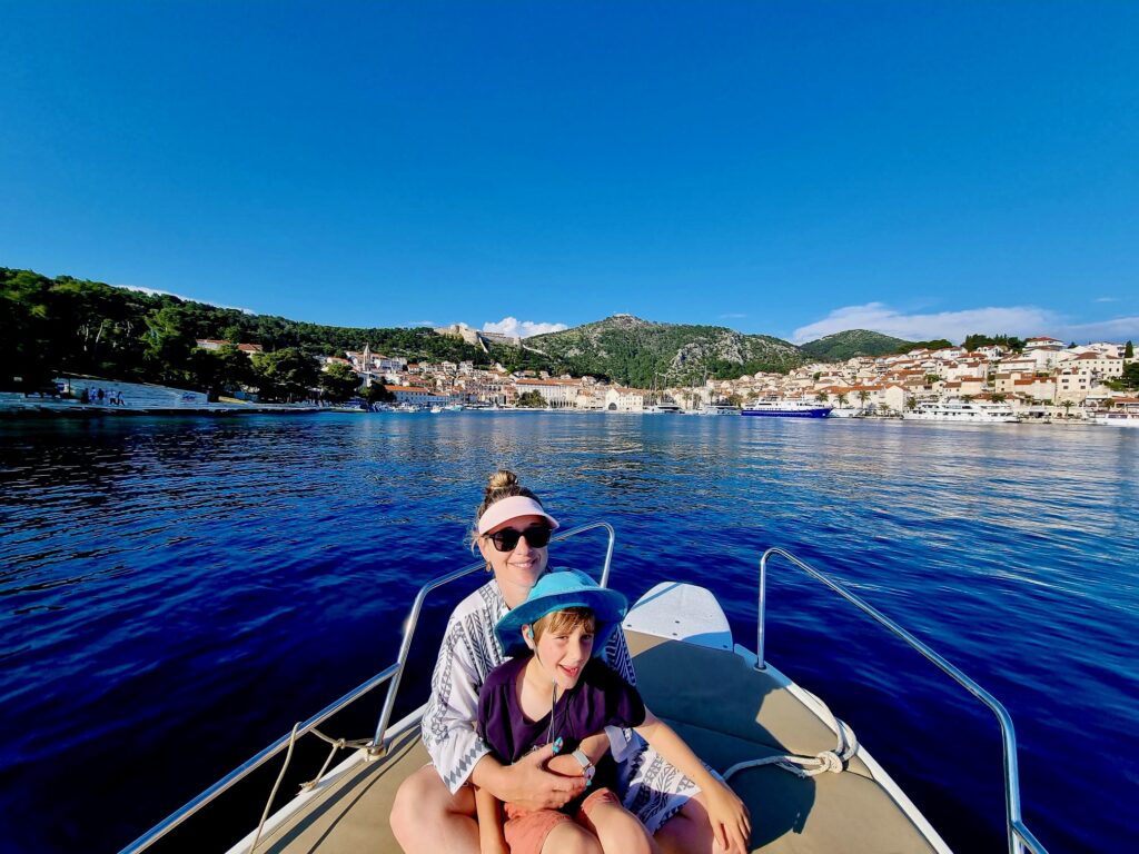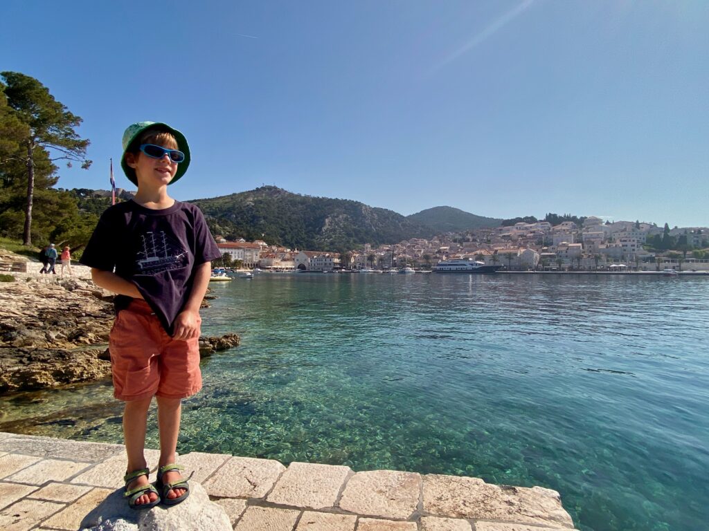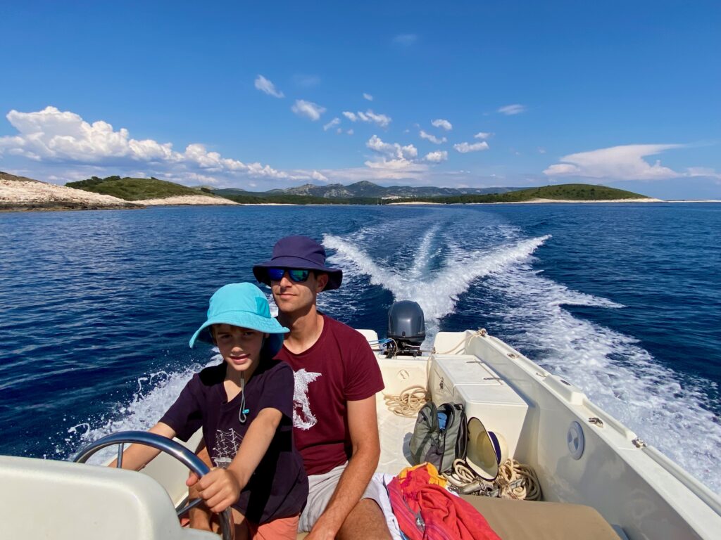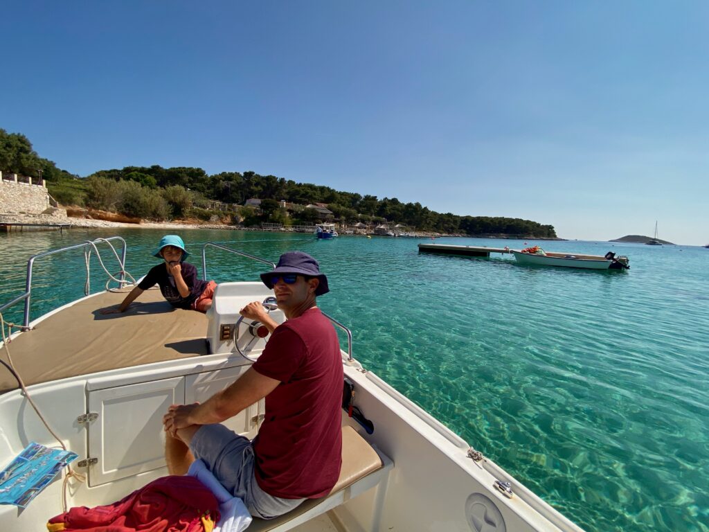 We wanted to visit some of the surrounding Pakleni Islands off the coast of Hvar but the excursion options were limited in the off-season (and too frankly long – we didn’t want to spend 10 hours on a tour, especially as we already did a boat tour and visited another “Blue Cave” in Kotor Bay, Montenegro). Instead, we started contacting some of the WhatsApp numbers posted on small boats around the Hvar harbor, as we read that we could rent our own boat for a few hours without a license. One responded and we met up later that day, where he asked if Dave knew how to drive a boat and, apparently satisfied with the minimally confident affirmative response, handed over the keys. But we had a really fun afternoon on the water, stopping for a jump in the sea (cold!), and even Jacob got to practice his boat-driving skills a bit. Interestingly there were a lot of jellyfish in late April so we could not swim in some areas off the islands. We couldn’t get over how crystal-clear the water was in significant depths, even with all of the boats around. Despite the tourism Croatia experiences, somehow the water has remained pristine (for now).