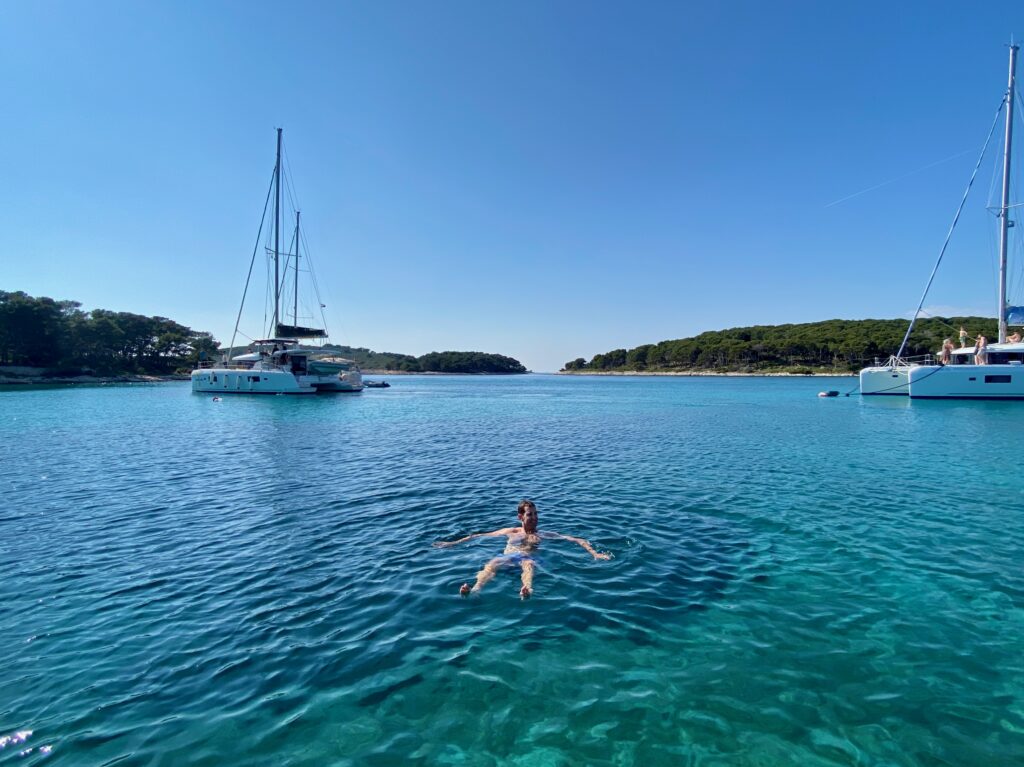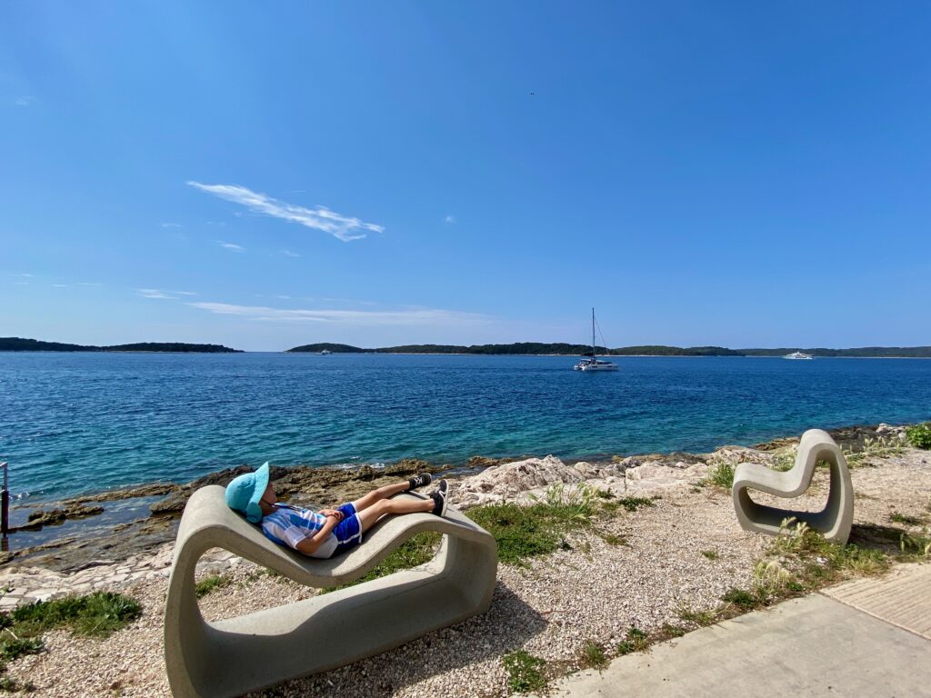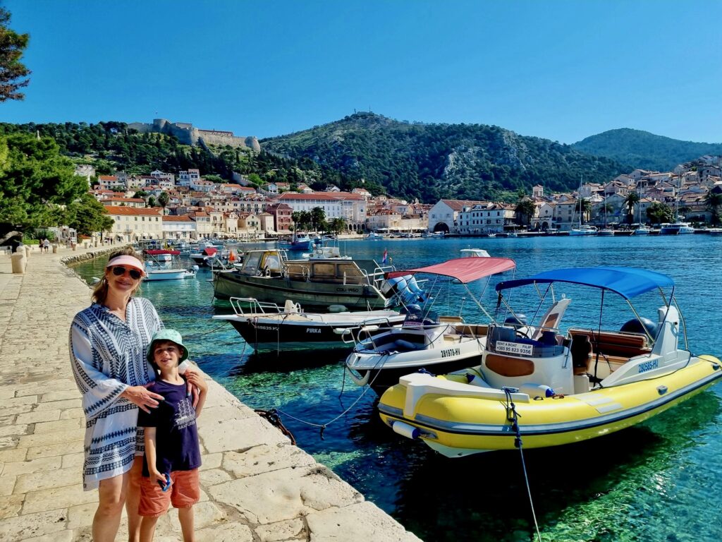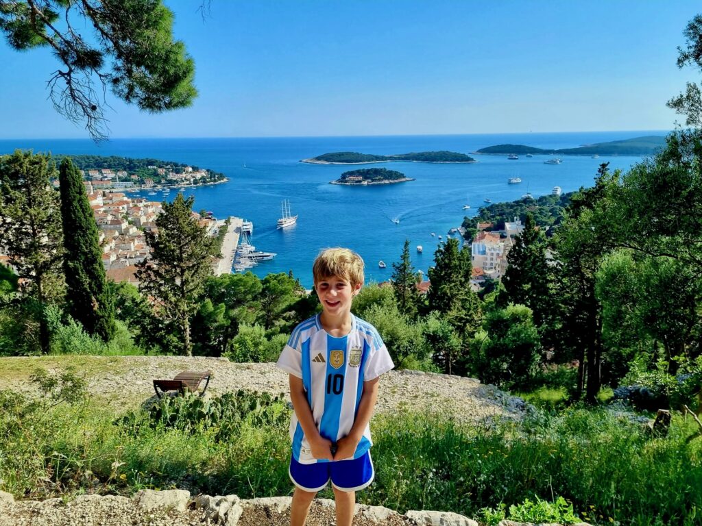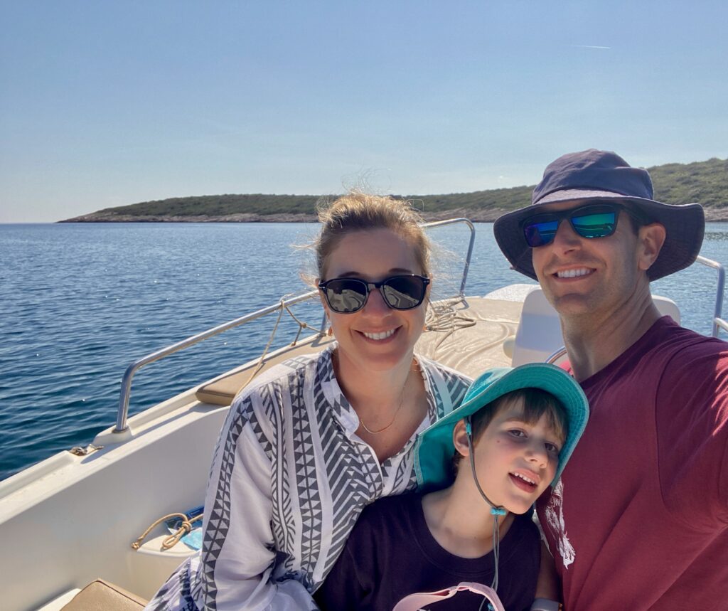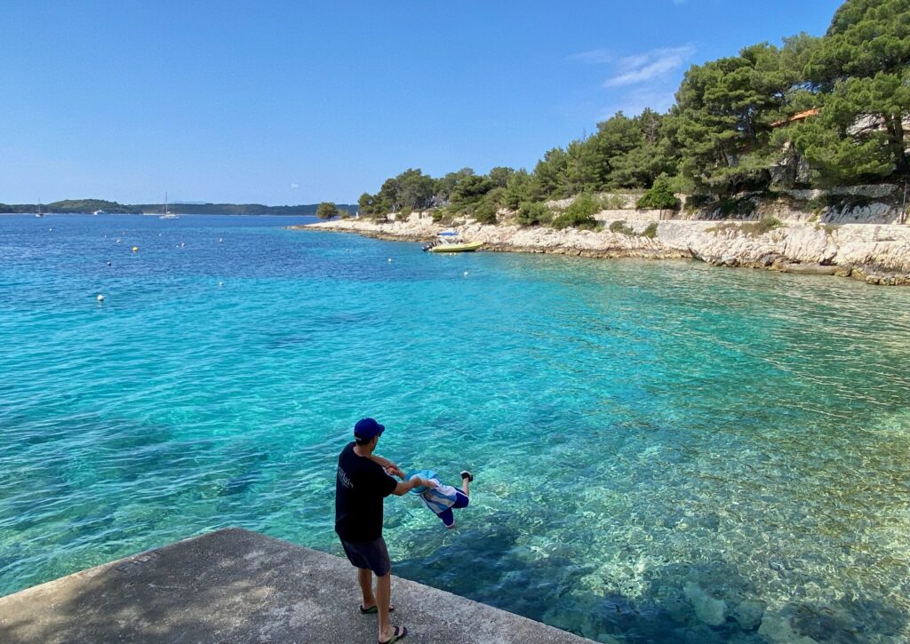 We wanted to visit some of the surrounding Pakleni Islands off the coast of Hvar but the excursion options were limited in the off-season (and too frankly long – we didn’t want to spend 10 hours on a tour, especially as we already did a boat tour and visited another “Blue Cave” in Kotor Bay, Montenegro). Instead, we started contacting some of the WhatsApp numbers posted on small boats around the Hvar harbor, as we read that we could rent our own boat for a few hours without a license. One responded and we met up later that day, where he asked if Dave knew how to drive a boat and, apparently satisfied with the minimally confident affirmative response, handed over the keys. But we had a really fun afternoon on the water, stopping for a jump in the sea (cold!), and even Jacob got to practice his boat-driving skills a bit. Interestingly there were a lot of jellyfish in late April so we could not swim in some areas off the islands. We couldn’t get over how crystal-clear the water was in significant depths, even with all of the boats around. Despite the tourism Croatia experiences, somehow the water has remained pristine (for now).