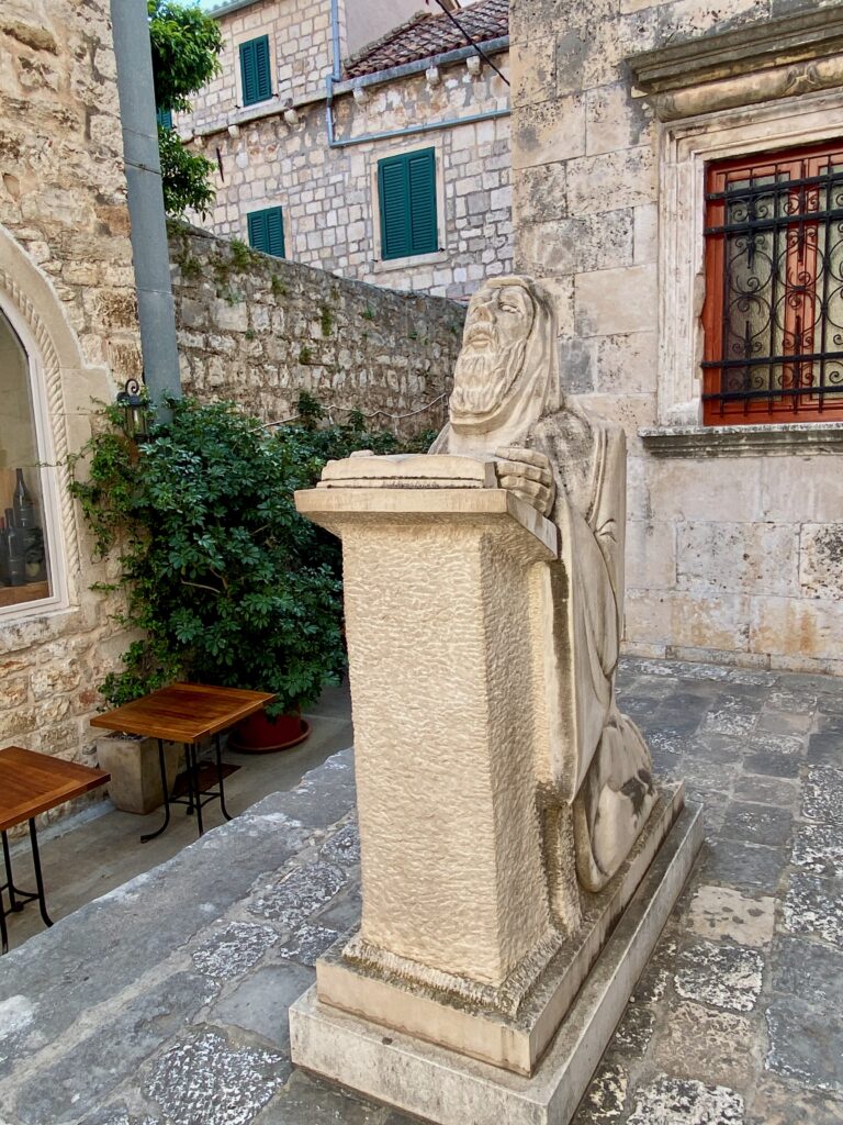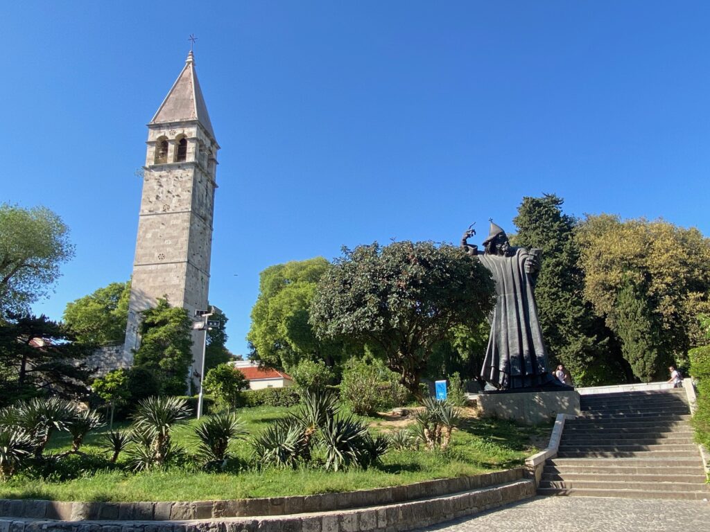 Diocletian’s Palace, which sits along the harbor in the Old Town, is really a marvel. The palace footprint is so large that it has since been integrated within various buildings, structures, and the street plan, so as you wander, you’re making your way through former Roman ruins at every turn. The main entrance at the Brass Gate leads you to cavernous cellars which were used for filming in Game of Thrones (the dragon “cages”). You then continue onto the Peristyle open square, framed by the Cathedral of St. Domnius and Jupiter’s Temple, and the Entry Vestibule (former domed pavilion leading to the emperor’s living quarters). We enjoyed exploring the twists and turns around the old city within the former palace walls, finally exiting at the Golden Gate to the large statue of Bishop Gregory of Nin (looks like a wizard).