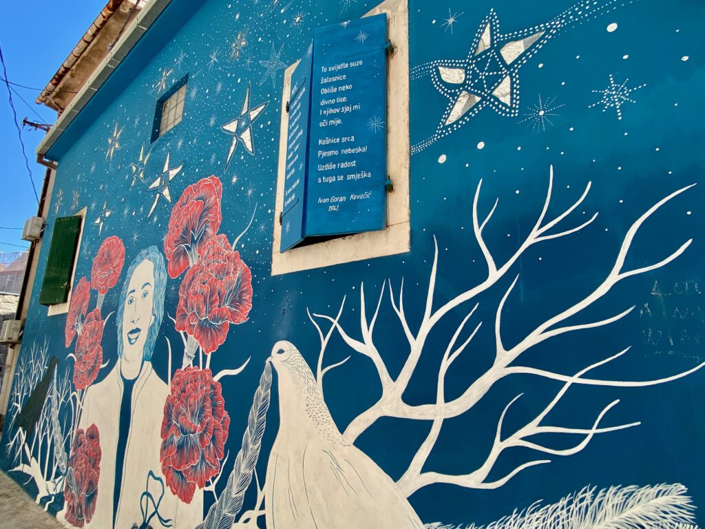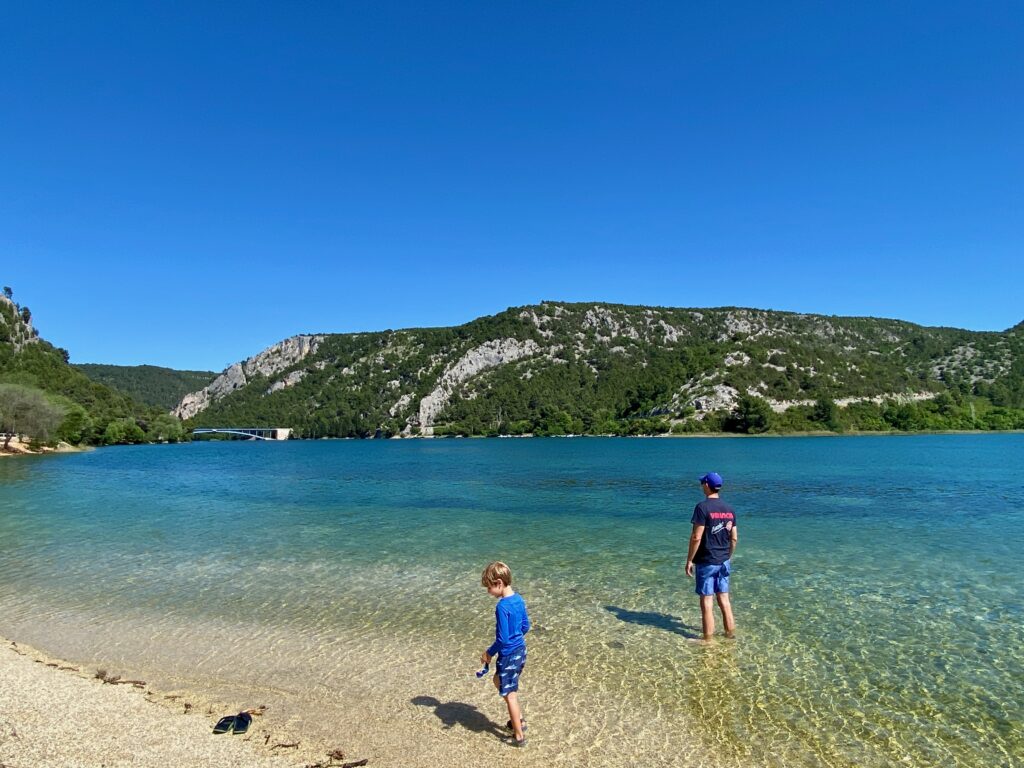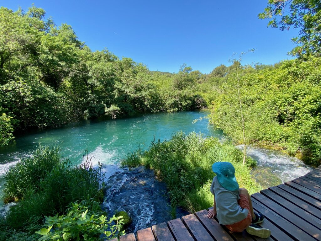 Without a rental car in Split, one option is to hop on one of the many guided excursions for a day trip. We decided to visit Krka National Park, known for its spectacular waterfalls (they aren’t very tall, but the setting is quite scenic); it was about a 45-minute to 1 hour drive from Split. We were glad we went with a tour bus because the main route to visit the park leads you on a raised wooden platform nature walk around the lagoons and small lakes eventually downhill to catch a riverboat (included in your ticket) to Skradin, a small town on the Krka River. Otherwise you’d have to do a loop and then drive down to see more of the area. While in Skradin there was a local crafts, artisans, and food market happening, so we had an opportunity to sample many products made and grown in the area. We also hit the pebbly beach and jumped in the river (quite refreshing!).